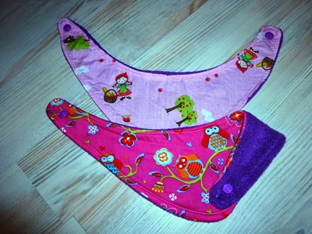 ich habe für unsere kleine Maus zwei neue Halstücher genäht, mit kuscheligem Fleecestoff auf der einen Seite. Den Rotkäppchen- und den Eulenstoff fand ich soo schön! Sie sind zwar nicht perfekt genäht, aber Aileen gefallen sie ;-).